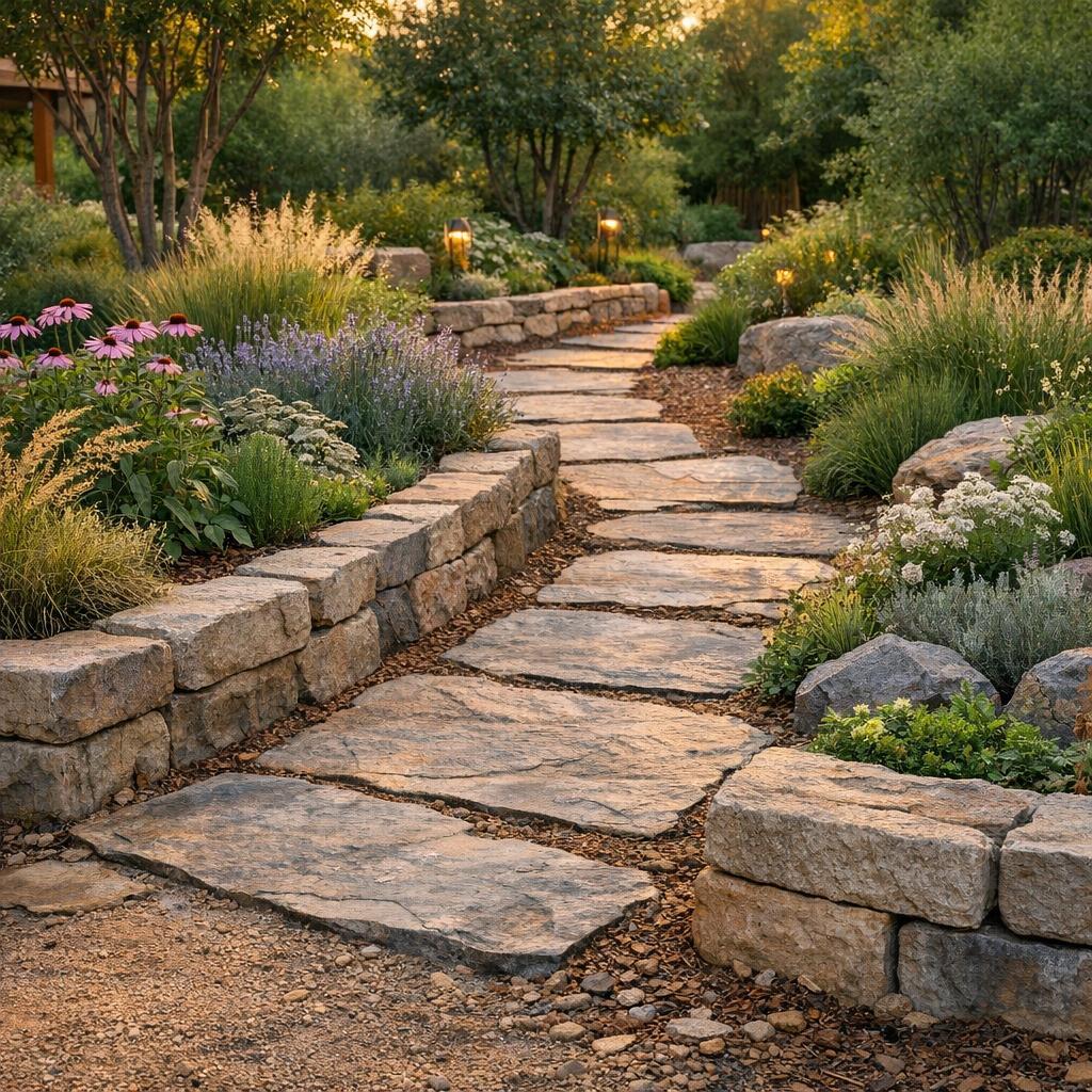 - Natürliche Wege aus Kies oder Steinplatten anlegen.